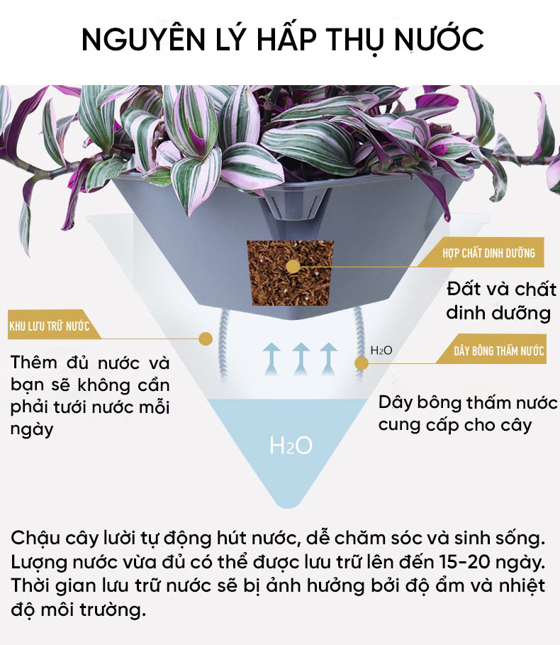 - dây Cotton hút nước từ khu lưu trữ nước ở đáy chậu cây, rồi sau đó sẽ giữ đất ẩm. Không cần tưới nước cho cây trồng mỗi ngày. Giúp bạn chăm sóc cây khi đi du lịch hay phải đi công tác dài ngày.